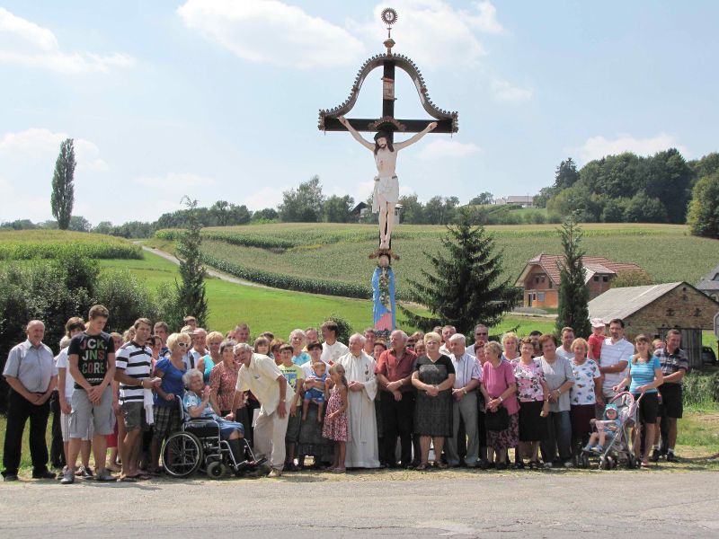 Križ, ki stoji ob cesti Lenart – Trate, je leta 1924 dal postaviti tedanji lastnik posesti Marko Rajšp. V kak namen je bil postavljen ni znano. Verjetno ob kak pomemben dogodek v zvezi z s prvo svetovno vojno. O zgodovini postavitve in obnove je spregovorila Sabina Majerič. Kot je povedala, je bil leta 1937 križ podrt in ponovno postavljen. Sedaj sta za obnovo poskrbela sedanja lastnika posesti, na kateri stoji križ, Cecilija in Miran Feiertag. Marijo in Križanega je obnovil ljudski umetnik Andrej Tomažič, zaščitno bakreno streho pa je izdelal mojster Anton Lončarič. Kakor je v teh krajih navada, je družina Feiertag za vse številne udeležence slovesnosti pri družini Šlebinger pripravili pogostitev in druženje.