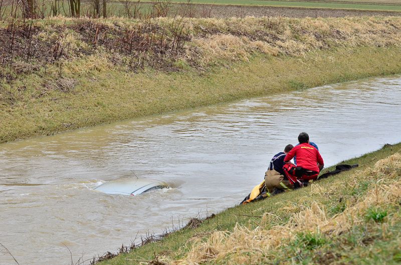 Voznica avtomobila je s ceste zapeljala v naraslo reko Ledava. Dva gasilca sta požrtvovalno skočila v mrzlo vodo...