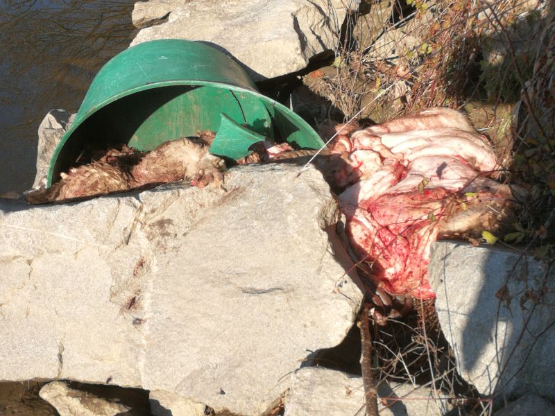 Dva kadavra različnih živali sta odvržena v zelenem škafu ležala ob stopnicah, ki jih vsakodnevno uporabljajo kajakaši in drugi obiskovalci tega umirjenega kotička ob reki.