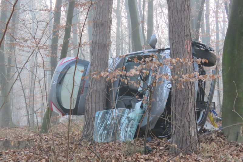 Po spolzkem vozišču končal v gozdu