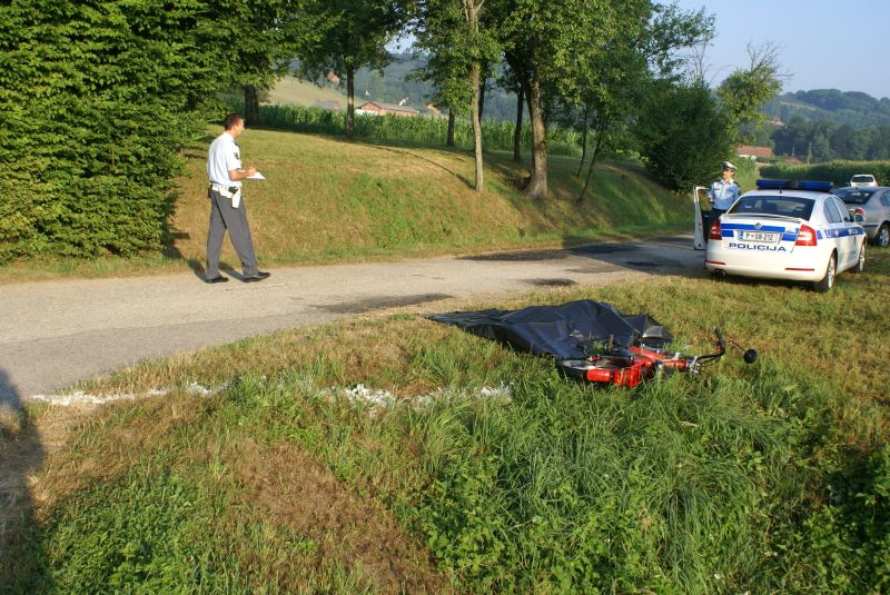 Gornja Radgona, 15. julija - Danes zgodaj zjutraj, ob 5.12 uri so operativci OKC PU Murska Sobota bili obveščeni, da se je v naselju Stogovci (UE Gornja Radona) zgodila huda prometna nesreča v kateri je ena oseba umrla. Takoj so, skupaj z gasilci PGD Gornja Radgona, odhiteli na kraj dogodka, kjer so ugotovili, da je 63 – letni domačin Jože Košir, med vožnjo proti domu, s kolesom s pomožnim motorjem, znamke Tomos Flexer, v Stogovcih, zapeljal na travnato brežino, padel in se zatem skotalil v jarek, kjer je bil najden mrtev. V jarku v katerem je bilo približno pol metra vode je nesrečni Košir torej tudi umrl, saj je dežurni zdravnik ZD Gornja Radgona lahko samo ugotovil smrt. Odrejena je bila sanitarna obdukcija, ki bo najbrž razvozlala celotni dogodek, vse pa kaže, da se je zgodila nesreča in je mopedist zapeljal v jarek, kjer je umrl. Zato, kot nam je povedal komandir PPP Murska Sobota Mojmir Zelko, policisti zadevo vodijo kot prometno nesrečo s smernim izidom, če bo obdukcija morebiti pokazala, da je pred nesrečo prišlo do infarkta, potem bo zadeva končana z dogodkom.