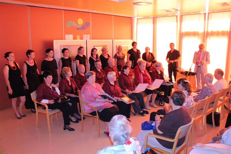 Pevski zbor stanovalcev radgonskega Doma je v svojem krajšem koncertnem nastopu zapel pet slovenskih pesmi in poslušalci so kar sami od sebe pritegnili bolj znanim melodijam. Trenutno ta pevska skupina šteje 15 članov in deluje že od konca leta 2008. Seveda pa se število pevcev spreminja zaradi objektivnih okoliščin, a jedro zbora ostaja vsa leta v bistvu enako. Že nekaj let ga vodi prostovoljka Majda Matjašič, ki so ji za njen nesebični trud posebej hvaležni 'njeni' pevci in vodstvo Doma. Kot gostje so nastopile pevke vokalne skupine Žarek, sicer članice Društva medicinskih sester in zdravstvenih tehnikov Pomurja. Kljub temu, da v taki zasedbi pojejo šele kratek čas, je zvok ženskih glasov bil čist in harmoničen ter nagrajen z obilnim aplavzom poslušalcev. Vodi jih zborovodja Matjaž Horvat, ki z njimi sodeluje šele dobro leto. Kot so pevke povedale, jim petje in druženje dajeta energijo in elan ter obenem prinašata sprostitev po napornem delovnem dnevu. Posebno jih veseli, da stroko zdravstvene nege in hkrati svoj poklic lahko predstavljajo tudi na kulturnem področju. Zato rade zapojejo na kulturnih prireditvah, nastopajo v zdravstvenih ustanovah, v domovih starejših, na strokovnih srečanjih in drugod, kamor jih povabijo.