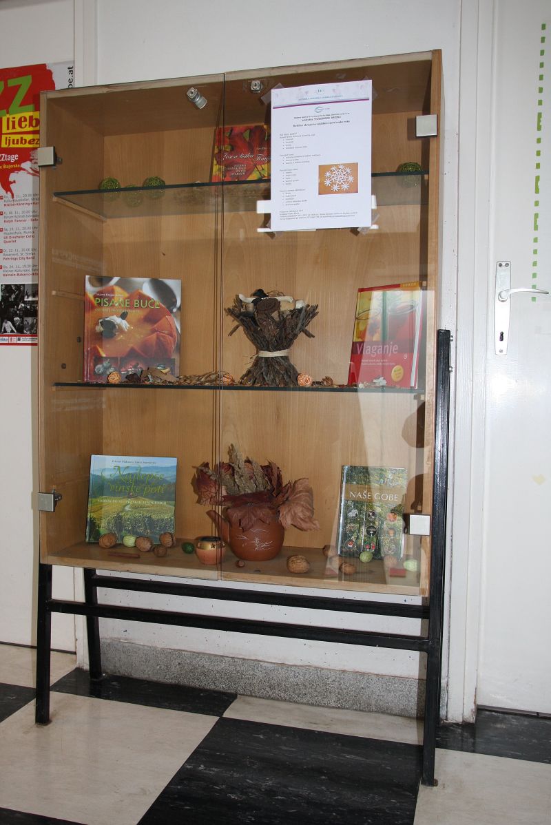 Jesen je čas, ko pobiramo jesenske pridelke. Na to so nas spomnili s skromno razstavo tudi v Ljudski univerzi Gornja Radgona, v oddelku Občinske knjižnice, ki so v razstavni vitrini pred vhodom v knjižnico, razstavili nekaj jesenskih plodov, ki bralcem prikažejo jesensko razpoloženje. V tej vitrino sicer knjižnica pripravlja tematske razstave ob raznih kulturnih dogodkih v knjižnici in okroglih obletnicah slovenskih pisateljev in pesnikov. Gotovo bodo tej dejavnosti, ko bodo dobili dodatne prostore, ki bi jih naj uredili v prostorih bivše prodajalne Mercator, posvetili še več pozornosti.