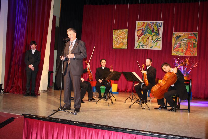 V Dvorani Kulturnega doma je v petek, 7. februarja, potekala osrednja občinska proslava ob slovenskem kulturnem prazniku. Praznovanje, ki je potekalo v organizaciji Kultprotura Gornja Radgona, se je začelo z odprtjem razstave slikarskih del Lojzeta Logarja, ki so jo odprli pred pričetkom proslave. Tudi oder je bil v znamenju slikarja Lojzeta Logarja, saj so odrsko sceno krasile tri njegove slike, ki jih je za to iz svoje zbirke prispeval rade Bakračević. Po zaigrani slovenski himni, ki so jo zaigrali člani Godalnega kvarteta Feguš, je povezovalec prireditve Tilen Artač, ki je bil obenem nastopajoči kot komik v, kulturnem delu programa, na oder povabil župana občine Gornja Radgona Antona Kampuša. V svojem nagovoru je med drugim povedal: »Malo pred tem smo v razstavni galeriji odprli razstavo likovnih del slikarja Lojzeta Logarja, s katero so organizatorji osrednje občinske proslave obogatili proslavo.« Dejal je tudi, da občina podpira kulturo in se že veseli skorajšnjega odprtja obnovljenega Burgeršpitala in v njem postavljene etnološke razstave. Za kulturni spored je poskrbel Godalni kvartet Feguš in humorist Tilen Artač, ki je ob vodenju proslave obiskovalce razvedril z oponašanjem znanih oseb iz javnega življenja. Oponašal je: Karla Erjavca, Bredo Pečan, Svetlano Makarovič, Milana Kučana in Jožeta Potrebuješ. S svojim prepričljivim oponašanjem je nasmejal občinstvo, ki se je v malem številu udeležilo proslave.