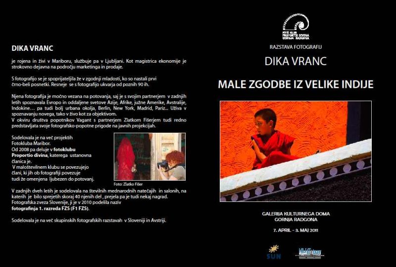 Na območju Gornje Radgone bodo ta teden odprli dve zanimivi razstavi, ki bosta gotovo pritegnila tako ljubitelje likovne umetnosti, kot fotografije. Najprej bodo v četrtek, 7. aprila ob 19. uri v galeriji Kulturnega doma v Gornji Radgoni odprli razstavo fotografij avtorice Dika Vranc pod naslovom: Male zgodbe iz velike Indije. Odlične fotografije z enega izmed številnih avtoričinih potepanj bodo na ogled do 3. maja.