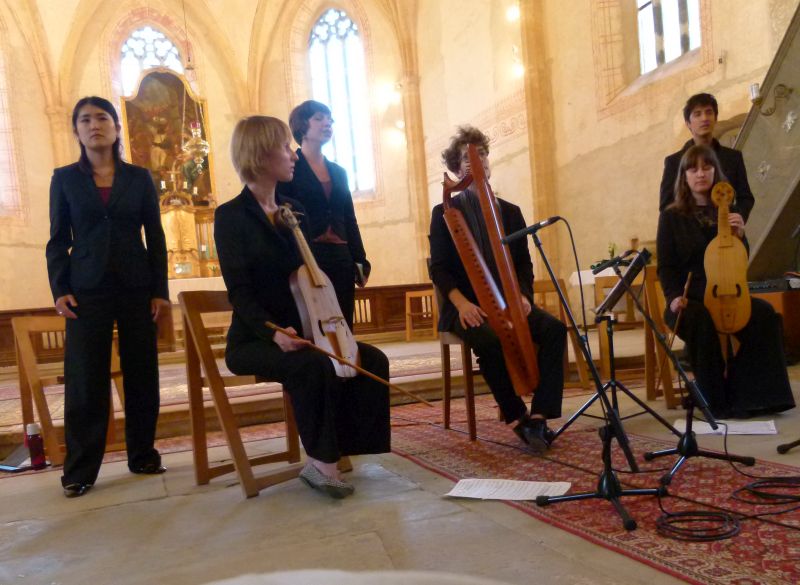 Čudoviti koncert so sicer izvajali člani ansambla: Sollazzo Ensemble (Perrine Devillers, sopran; Yukie Sato, sopran; Vivien Simon, tenor; Sophia Danilevski, srednjeveški fidel; Vincent Kibildis, harfa, Anna Danilevskaia, srednjeveški fidel, vodstvo). Člani ansambla Solazzo Ensemble so oblikovali program z uporabo historične izvajalske prakse in raziskovanjem glasbenega, kulturnega in umetniškega področja obdobja, ki jih zanima (pribi. 1350-1550). Švicarski ansambel se nam je predstavil s svojim projektom „Moralistične pesmi srednjega veka“, s katerim so ponudili širše raziskovanje posebnega vidika svojega repertoarja – etike v pesmih, ki je za razliko od dvorne ljubezni ali viteštva, ki sta močno raziskani temi, redko obravnavana. Vseeno pa ima vsak skladatelj poznega srednjega veka vsaj eno skladbo, katere besedilo razkriva osebna stališča na moralo. Prav ta vpogled v njihovo osebnost je tisto, kar želijo švicarski glasbeniki zajeti v svojem repertoarju in deliti s poslušalci na koncertu.