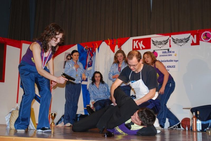 Zelo prepričljivo so igro uprizorili: košarkarice Marija Sarjaš, Janja Bürmen, Klementina Zelko, Maja Tibaut, ki so novinke v črenšovski gledališki skupini, ter Romana Glavač, Miha Halas v vlogi odstopljenega trenerja, Damijan Hozjan kot nov predsednik kluba in Matej Kolenko, ki je upodobil trenerja Sulejmana.