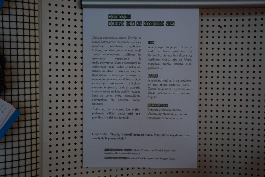 Vsestranska umetnica Milena M. Reščič iz Gornje Radgone je v Pokrajinski in študijski knjižnici (PiŠK) v Murski Soboti, odprla nadvse zanimivo razstavo nekaterih svojih del, ki jo je poimenovala Vendar drevo ima še stotero vej. Tudi tokrat je priljubljena Reščičeva svoja slikarska in kiparska dela združila s poezijo moža Dominka Reščiča. Omenjena, nadvse zanimiva razstava, ki je na ogled prav pri vhodu v največjo pomursko knjižnico, bi morala biti že lani, a je iz znanih razlogov bila preložena na sedanji ugodnejši čas. Letos je obseg razstave manjši za nekaj del, a kljub temu se vse skupaj izplača ogledati. „Tokratna dela so zaokrožena celota. Zemlja in človek kot časovno omejen del njenega prostora. Potopljene, izgubljene kulture; preračunljivost v vsej svoji zaviti enostavnosti; vabljivost in nevarnost vzpenjanja k nedosegljivemu; iskanje neprostora in smiselnost tega; vedno je nekaj ali nekdo, ki vleče in usmerja vse, če dopustimo; v življenju ostanejo za nami odlupljene resnice, dobre in zle; v minevanju ostanemo velikokrat samotni in prazni; vsak si ustvarja svoje prostore podob; stalnici našega časa so vojne vihre, postavljanje spomenikov in nenehno vrenje nasprotij; zemeljska semena in darovi so dodeljeni le nekaterim“, o razstavi razmišlja avtorica, ki mimogrede izvira iz umetniške družine na Meleh pri Gornji Radgoni.
