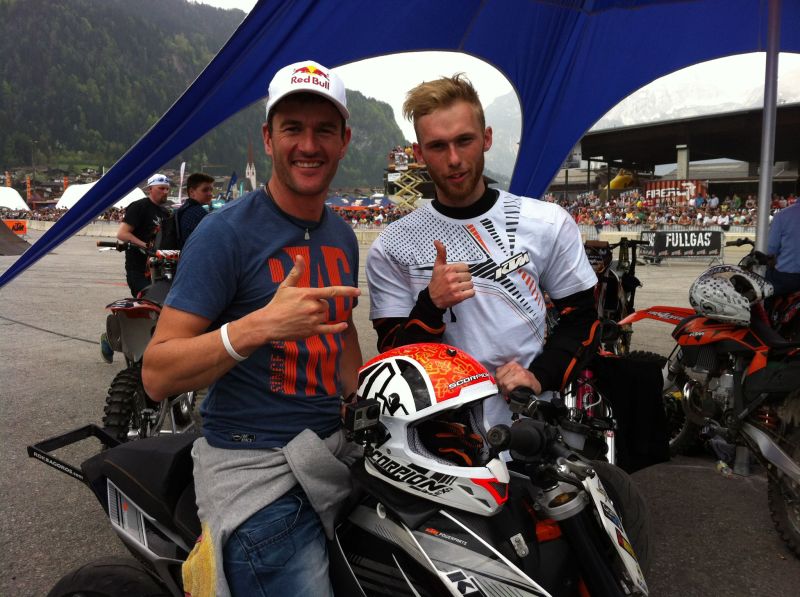 Minule dni je v tirolski dolini Zillertal dobesedno grmelo! Na kupu so se namreč zbrali ekstremni športniki, ki so na letošnjem dnevu »Kini fullgas« pripravili adrenalinsko predstavo. Med nastopajočimi, kjer so blesteli Kimi Räikkönen, David Coulthard in Felix Baumgartner, je že drugo leto zapored svojo virtuoznost pokazal tudi znani slovenski ekstremni motorist Rok Bagoroš, KTM-ov tovarniški stunt voznik. Ob tej priložnosti je prvič prikazal povsem nov nastop in z ekipo posnel še atraktivni video. Ves izkupiček od tradicionalne prireditve, gre vedno za fundacijo Wings for life, katere glavni cilj je najti zdravilo za poškodbe hrbtenice. Vsi športniki, ki nastopijo pred več deset tisoč gledalci, se tako združijo v eno samo adrenalinsko-bencinsko predstavo, ki bruha dim in ogenj. Poleg freestyle motokrosistov, ki prek rampe letijo po 30 metrov daleč in 15 metrov visoko ter vmes izvajajo salte in podobne dih jemajoče trike, v zraku vedno nastopi red bullova leteča »eskadrila«, na asfaltu pa motoristi »stunterji« ter »drift« avtomobili s 700 »konji«. Tako se na tleh odvija pravi stampedo motornih konjev.