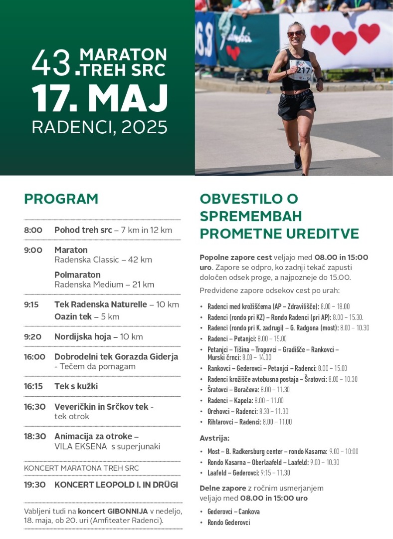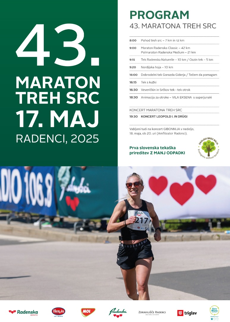 Na maratonsko soboto, 17. maja, se v Radencih obeta pravi tekaški praznik. 43. Maraton treh src bo znova povezal Radence in sosednjo avstrijsko občino Bad Radkersburg, udeleženci pa bodo lahko izbirali med štirimi tekaškimi razdaljami (5, 10, 21 in 42 km), nordijsko hojo, otroškimi teki, tekom s kužki, novim Tekom treh src ter Pohodom treh src. Veliko zanimanja je tudi za bogat popoldanski program, namenjen vsem generacijam.